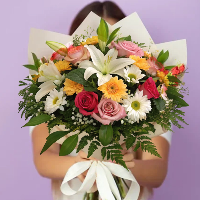 Este ramo incluye una delicada selección de flores de temporada, acompañadas de follaje verde que realza su belleza natural. Ideal para cumpleaños, aniversarios, agradecimientos o simplemente para decir “te pienso”.